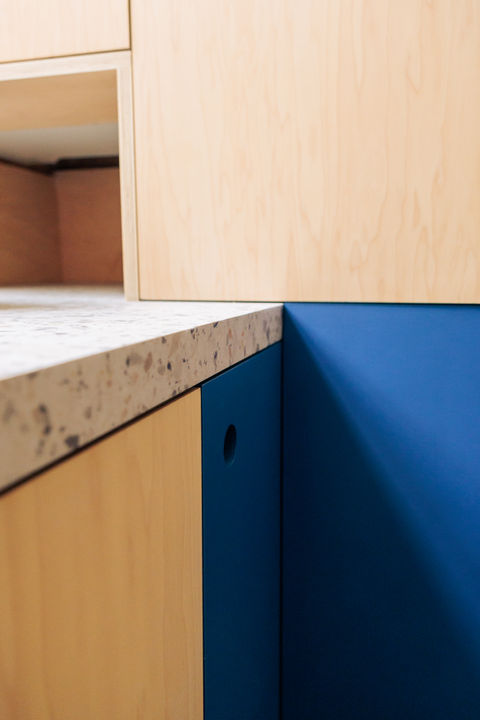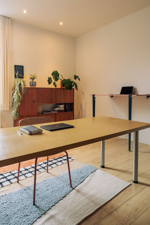 De open leefruimte met keuken vormt het hart van de woning, waar koken, tafelen en samenleven naadloos in elkaar overvloeien. De met leem afgewerkte muren zorgen voor warmte en karakter, terwijl de op maat gemaakte eetbank uitnodigt tot lange, gezellige diners. Grote raampartijen brengen overvloedig daglicht binnen en creëren een mooie verbinding met de tuin.